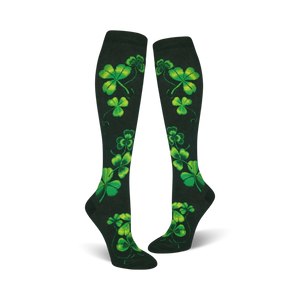 Get your lucky charm on with these Shamrock Knee-Highs! Perfect for St. Patrick's Day, these dark green socks are covered in a pattern of bright green four-leaf clovers with yellow outlines. Whether you're hitting the parade route or just looking to add a little Irish flair to your everyday style, these socks are sure to bring a smile to your face. So pucker up and kiss the blarney stone in these festive foot warmers, because as the Irish say, 'May your socks be forever dry, and your pockets heavy with gold!'