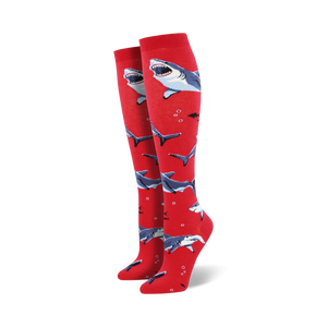 Sharks get a bad rep. In reality, more people are killed by bee stings and lightning than by a shark. If you love these misunderstood sea creatures, you will appreciate these fun women's novelty crew socks. Each pair has cool-looking sharks printed all over against a blood-red background.