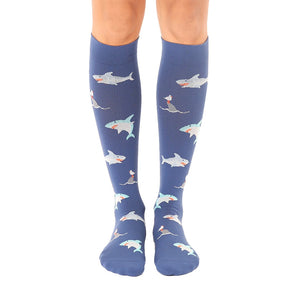 Get ready to dive into a sea of style with our Shark socks! These knee-high wonders feature sharks, mice, and fish swimming in harmony. The sharks have got fierce grins revealing one sharp tooth, the mice are rocking their brown coats and peeping eyes, and the fish are swimming by in their orange glory. Whether you're a landlubber or a seafarer, these socks will add a splash of fun to your everyday adventures. Get ready to make a tidal wave of fashion wherever you go!
