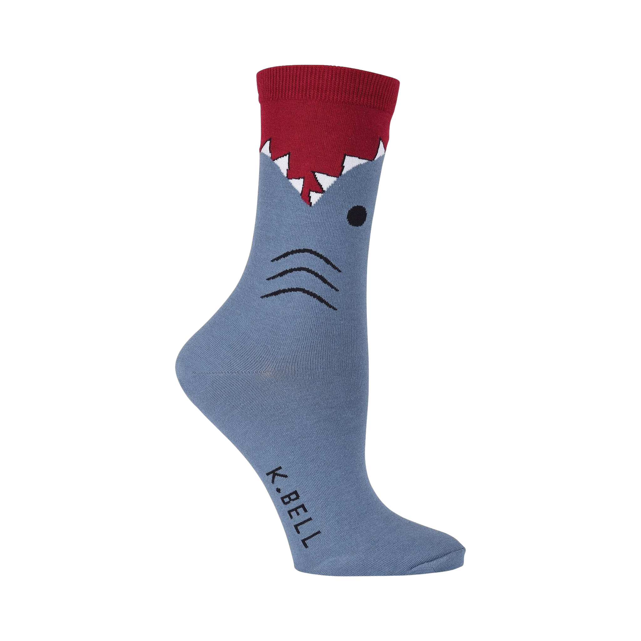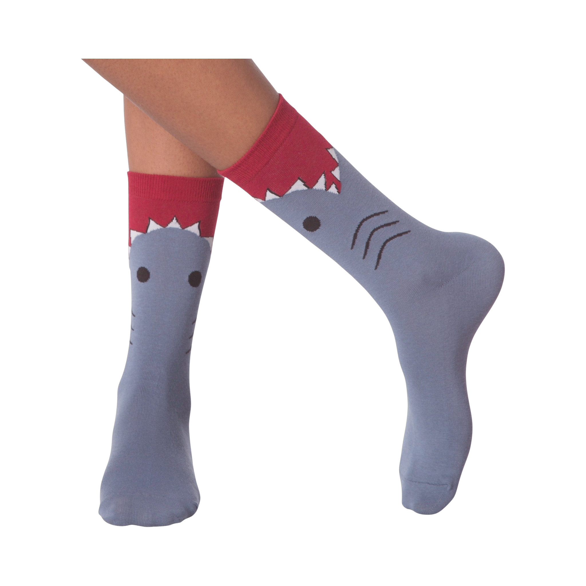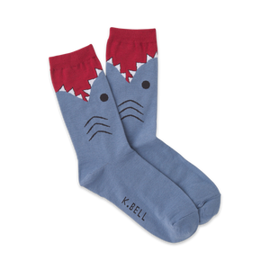 Nom! Nom! Take a bite out of some comfy new footwear with these deep sea sensations! This pair of gray and red women's crew socks features a shark figure biting his way up your leg. Whether you are a fan of Shark Week or just sharks in general, they will be the perfect fit.