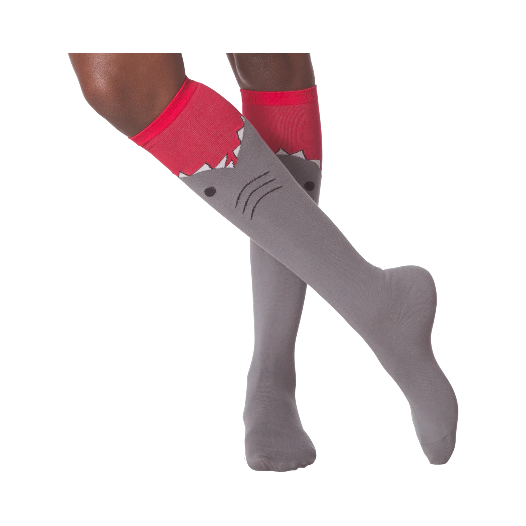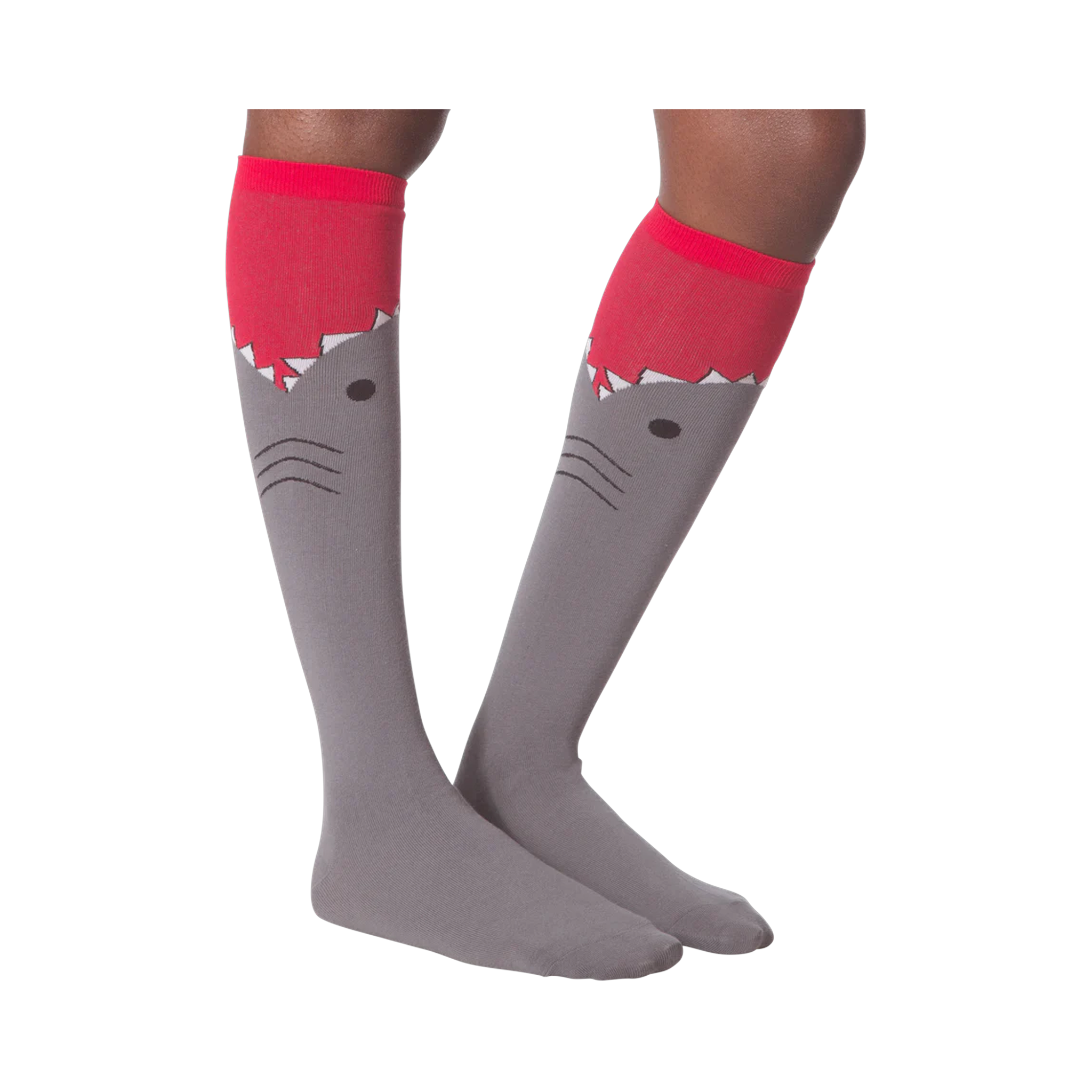 Take a large bite out of fashion and show off your love for the most feared beast of the sea! This pair of gray and red knee high socks features a large shark biting up the calf detailed with gills and teeth. No fishy person would dare cross you wearing these ferocious socks!