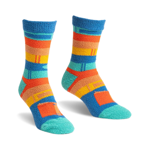 There's something magical about a stack of books, each one a portal to a different world. Now imagine that joy wrapped up in fuzzy slipper socks, where vibrant stripes of blue, orange, yellow, and green create a cozy, delightful blend. Perfect for those who find solace in a good book and the snug comfort of warm feet, these socks are your new favorite reading companion.