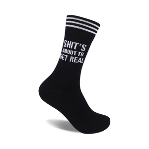Buckle up, folks these socks are about to drop some serious truth bombs! Slip on a pair of our "Shit's About To Get Real" socks and let the world know you're ready to take on whatever life throws your way. With their bold black and white design and no-nonsense message, these socks are the ultimate accessory for the go-getters, the dream chasers, and anyone who's ready to embrace the wild ride of life. So step into a pair and get ready to make things happen the realness is about to hit, and you're gonna rock it!