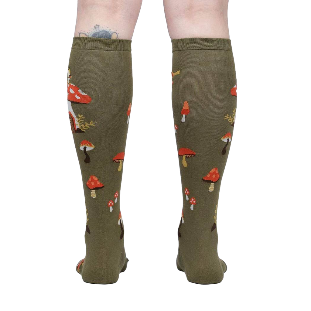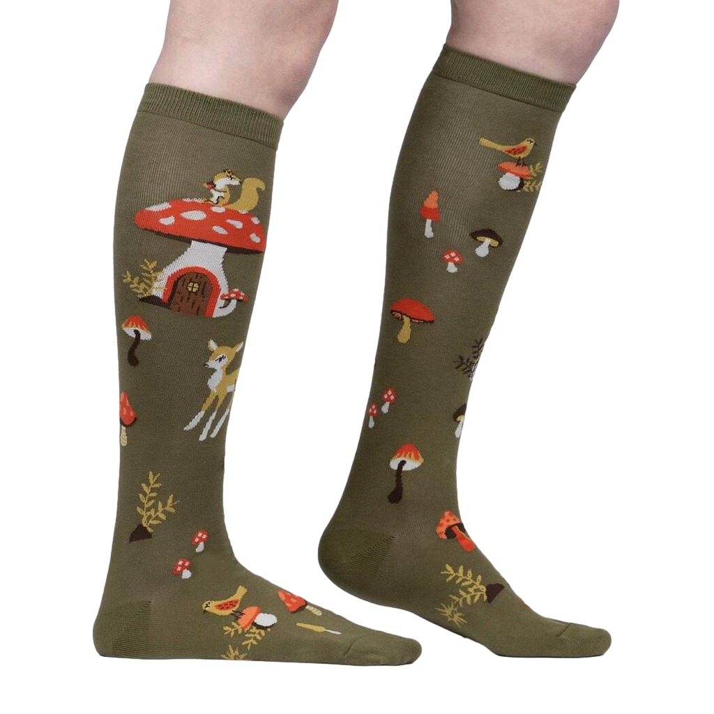 Get ready to elevate your sock game with our knee-high "Shroom and Board" socks. You'll be the envy of the forest with their dark olive green color and vibrant illustrations of red and orange mushrooms, which are a favorite of squirrels, foxes, rabbits, and even birds. It's like a whimsical woodland adventure right on your feet!
