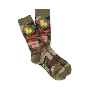 Got too much senseless quacking going on in your life? Tell everyone to shut the quack up with these funny socks! If you have a plucky sense of humor and love ducks, we've got something quacktastic for you! This cool pair of camouflage colored crew socks features an adorable rubber ducky with the phrase "Shut the duck up" in orange above the ankle. Slip on a pair of these cool socks and tell everyone how you really feel.