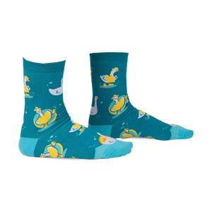 Ok, check out these socks. They're a vibrant teal, like a deep pond on a sunny day. All over, you'll spot white geese chilling out. Some are just swimming along, elegant and serene, with their orange beaks visible. Others are truly embracing relaxation, floating in bright yellow inner tubes, sporting little yellow hats. The toes and heels are a contrasting light blue, adding a nice pop. They've got a fun, whimsical vibe, perfect for anyone who loves a bit of playful charm on their feet. These are definitely for bringing some lightheartedness to your day.