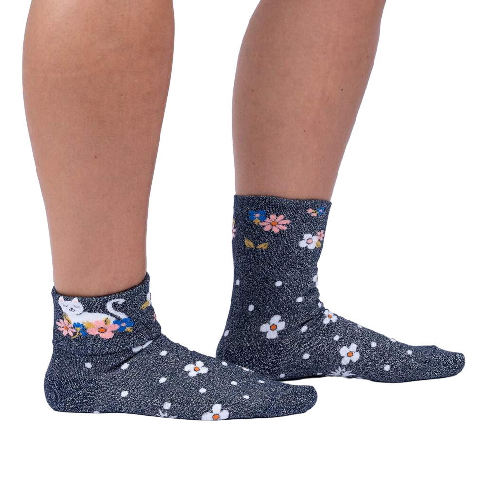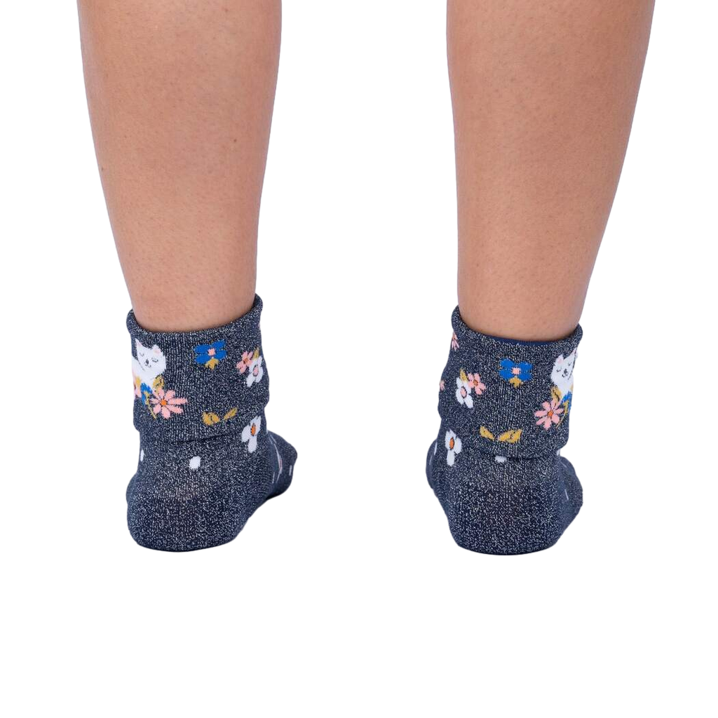 Purrfect pick for cat enthusiasts! Sitting Kitty Turn Cuff socks sprinkle white kitties and multicolored blooms on your feet for cozy fun. These stylish ankle socks add a pop of whimsy to any outfit.