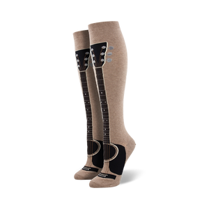 Strum your way to style with these Knee High Six String socks! Strut your stuff adorned in tan and brown shades and a pattern of acoustic guitars with black fretboards and strings. Be the rockstar wherever you go!