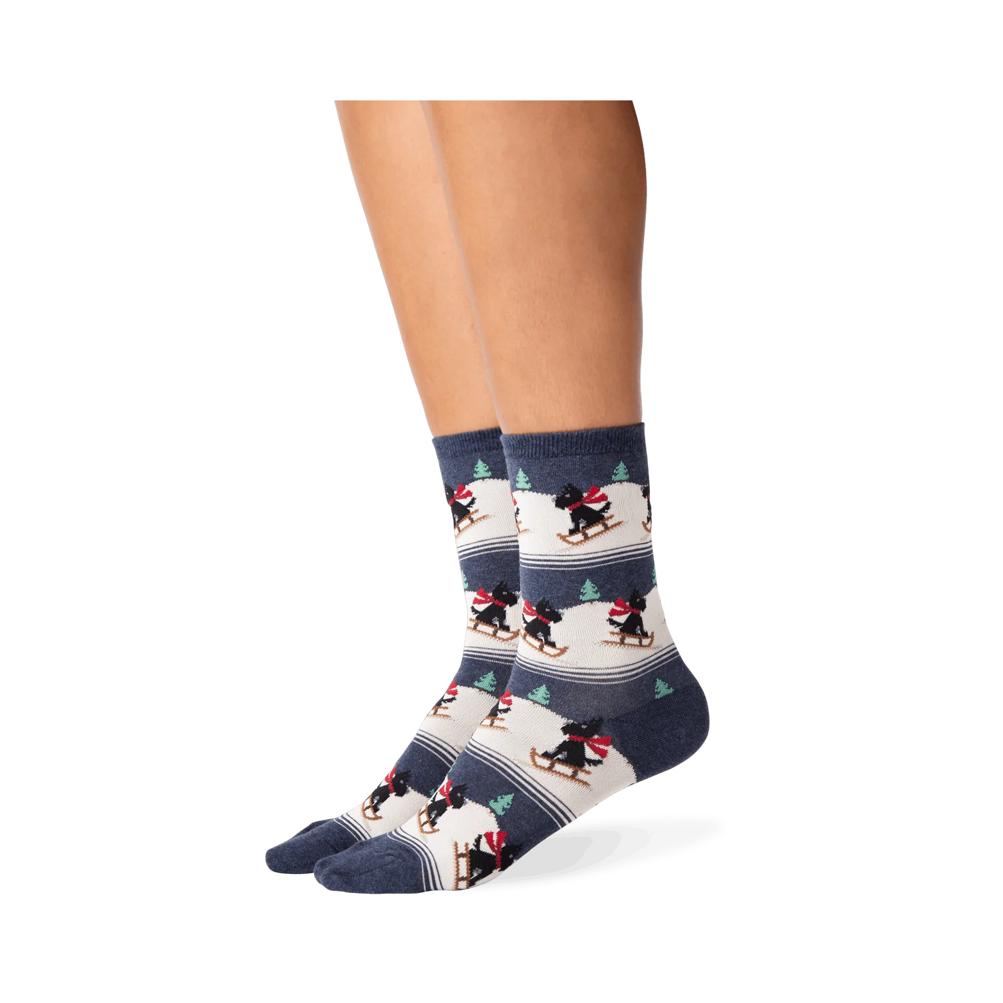Sledding Scottie Dogs are the perfect accessory for any winter warrior. These navy blue socks feature a squad of Scottie dogs bundled up and ready to hit the slopes. With red scarves and black top hats, these pups are sure to turn heads wherever you go. Whether you're hitting the bunny hill or the black diamond, these socks will keep your feet warm and stylish. So gear up, grab your board, and let's shred!