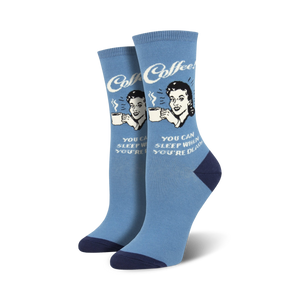 With these "Sleep When You're Dead" socks, you'll be drinking coffee in style. These comfy blue crew socks, designed especially for women, feature the slogan "Coffee! You Can Sleep When You're Dead," along with an image of a woman enjoying a steamy cup. Show off your coffee love and energize your day with each step you take. Slip into a pair of these socks and let the caffeine-fueled fun begin! Stay wide awake and conquer the world, one coffee-filled step at a time!