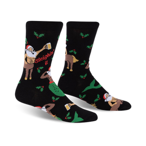 Sleighin' It with Santa: Get ready for Christmas in the most mythical way possible with these party-ready Sleighin' It holiday novelty men's crew length Socks! These black, green, and red festive winter-themed hosiery are made to show your mythical and festive side. With centaurs, mermaids, holly leaves, and red berries, these joyous mythological Christmas party characters will make your toes extra jolly!
