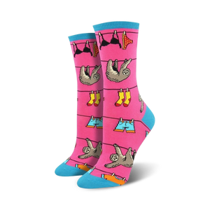 Sloths love hanging out in the sun as much as your freshly washed, wet clothes do. Each fun pair of women's novelty crew socks feature sloths, undergarments, shirts, and shorts hanging on a clothing line printed all over against a pink background. The cuffs, heels, and toe lines are blue.