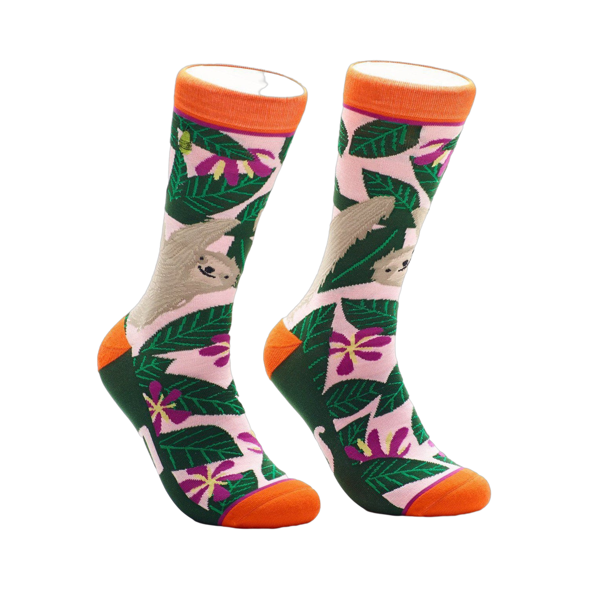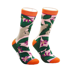 Channel your inner sloth and slow down with these sassy tropical socks! Featuring cute sloths hanging in trees on a bed of vibrant leaves and flowers in pink, green, and purple, these crew socks are sure to add a touch of fun and relaxation to your day. With the reminder 'Slow Down' printed on the sole, these socks are perfect for anyone who needs a reminder to take a break and enjoy the little things in life.