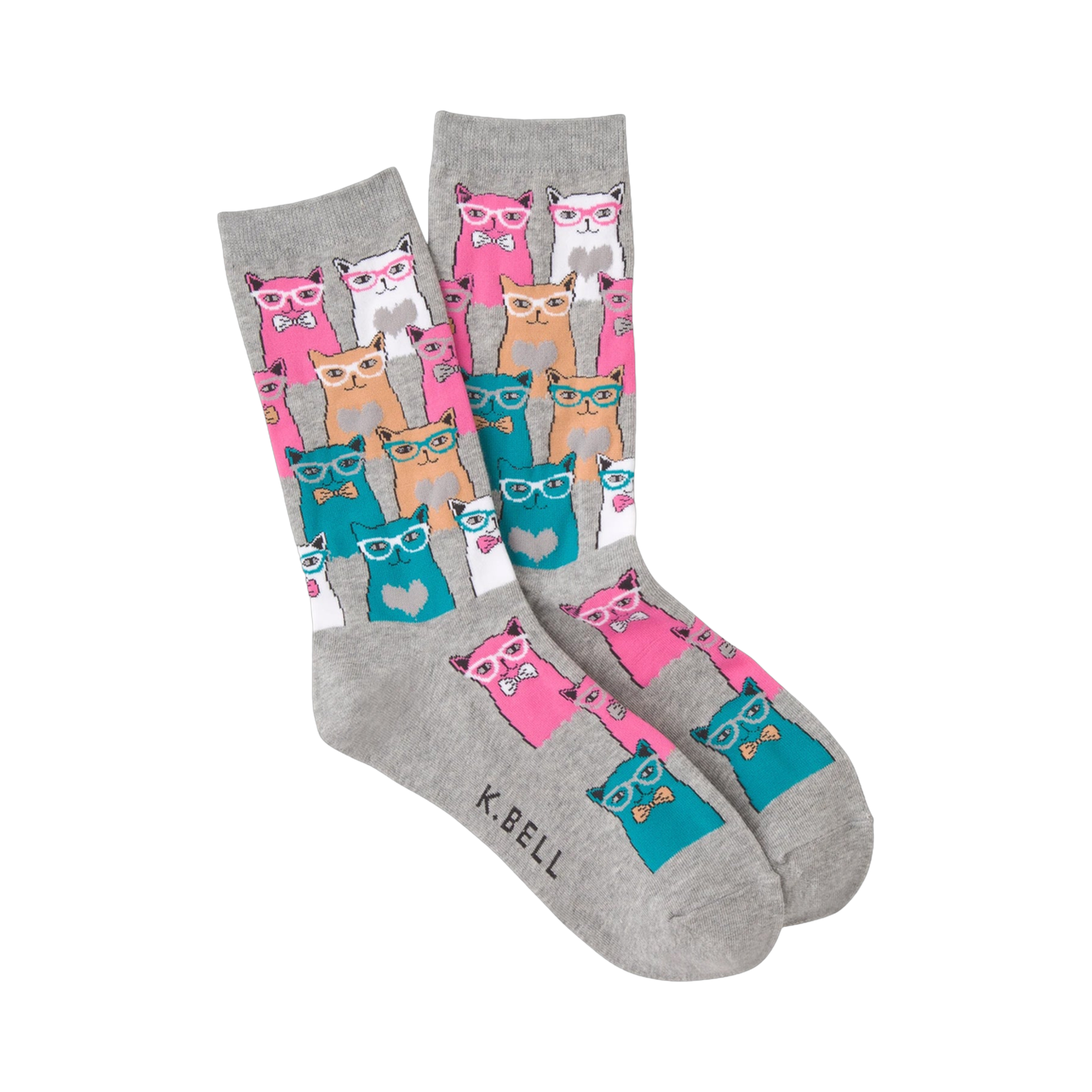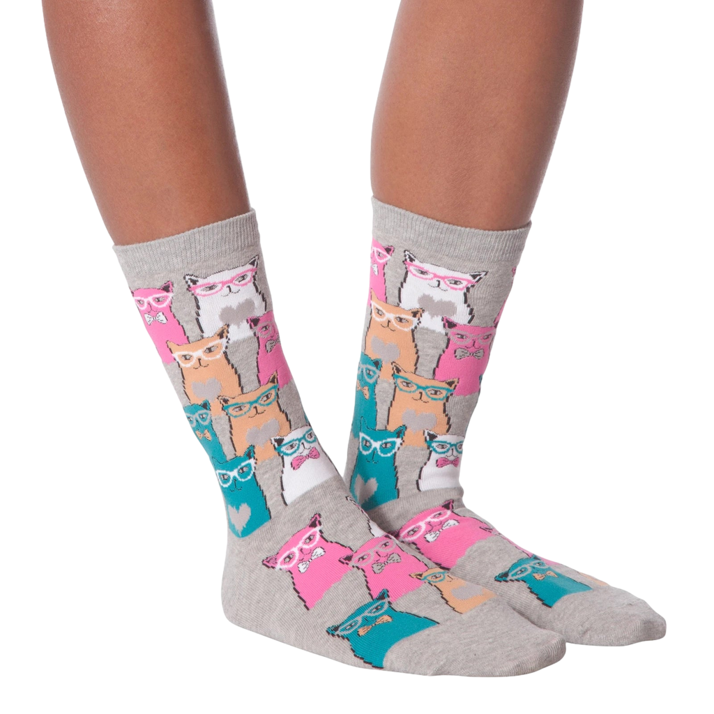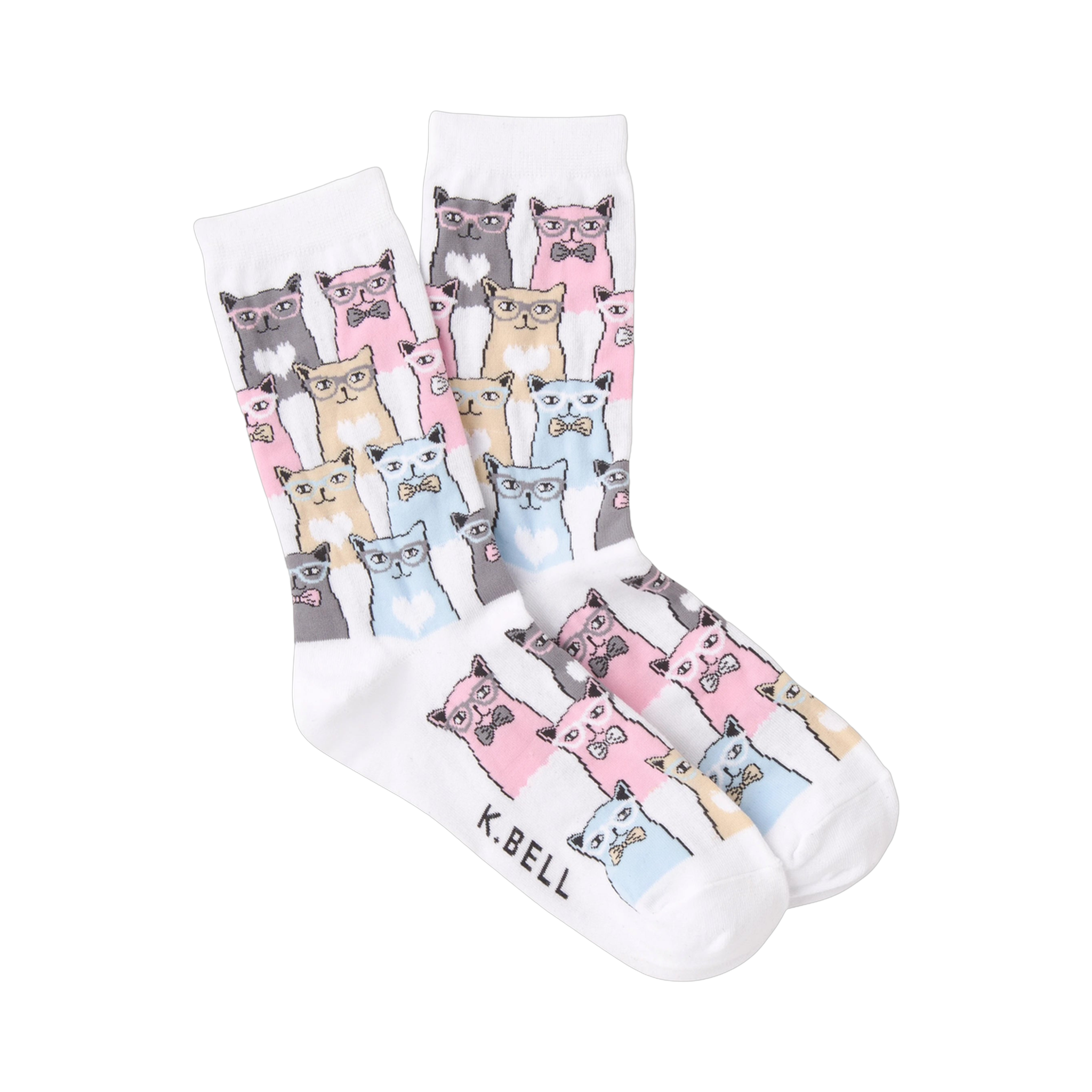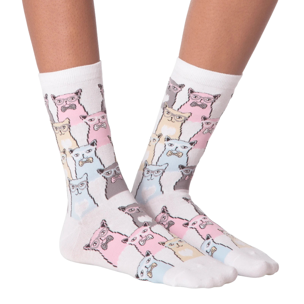 Fancy a fun pair of socks that will have you looking like a sophisticated and well educated puss? This cool pair of white crew socks will be the purrfect fit! Each crazy pair of feline inspired greatness features an all over print of colorful cats wearing glasses and bow ties. You'll look pawsitively dashing in them!