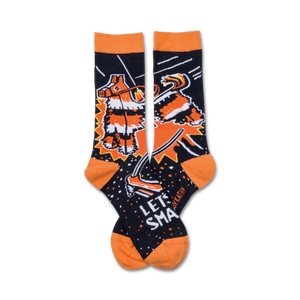 Smash the party with these "Let's Get Smashed" socks! Featuring an ongoing pattern of a cartoon piñata smacked with a stick, these unisex crew socks are sure to be a smashing hit. The vibrant black, orange, and white colors will add some fun to your outfit, and the Let's Smash text above the piñata will remind you to smash through your goals with vigor.