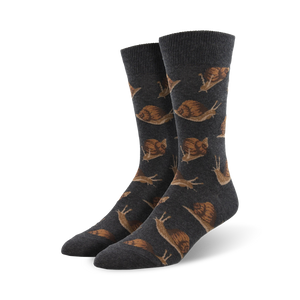 Snail's pace right into fun with these dark gray cotton crew socks adorned with adorable brown snails. Let their light brown shells and dark brown bodies remind you to take life at your own speed. They're just the thing for those days when you want to go slow and steady. Perfect for the guy who likes things at a snail's pace.