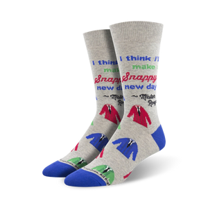 Good news, neighbor! Make every day snappy with these gray dress sock covered in a pattern of blue, red, and green suit jackets. Featuring a rib cuff and Mister Rogers' quote, "I think I'll make it a snappy new day," these cotton socks are so comfy and fun you'll feel like you're putting on a cozy hug. Wear Mister Rogers' Snappy Dresser socks to get a boost of inspiration and nostalgia from your favorite childhood TV host. Available in men's crew length.