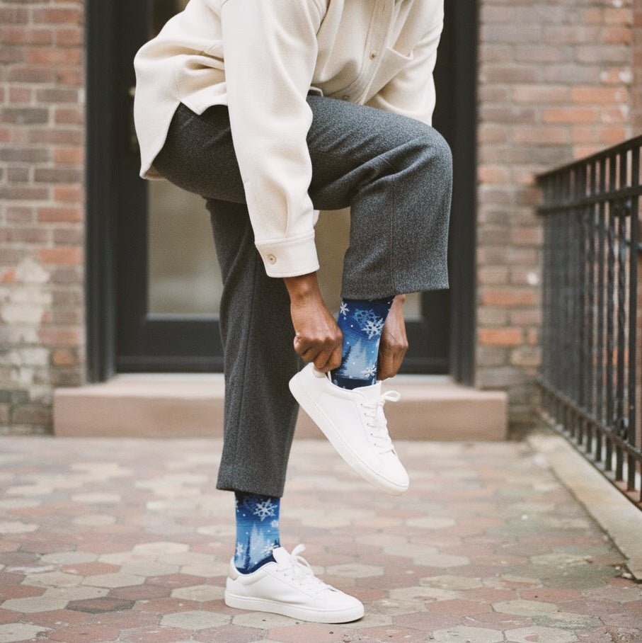 When the chill of winter wraps the world in a snowy embrace, these socks are here to remind you of its serene beauty all year long. The Snowflakes Men's Crew Socks - Into the Blue are like a cozy canvas of a winter's eve, capturing a blue evening sky where snowflakes dance their way down to a tranquil scene. With snow-kissed pines and a lake reflecting the frozen splendor, these socks are the perfect blend of whimsy and wonder.