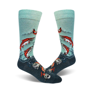 These Sockeye Salmon Crew Socks are swimming in style! Dive into a blue wave of comfort as these vibrant red, blue, and green fish playfully encircle your feet. Salmon may swim upstream, but these socks will have you floating on clouds all day long. Make a splash and reel in compliments wherever you go!