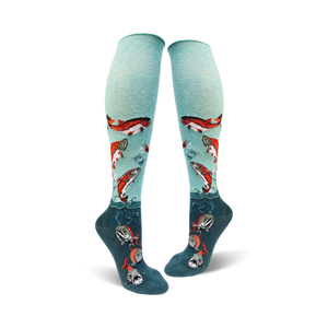 Sockeye Salmon Roll Top Knee High Socks for Women: These knee-high socks are the bee's knees for salmon lovers. Their minty green and teal design with a pattern of sockeye salmon swimming upstream is sure to make a splash. From the first step out of bed in the morning to the last dance of the night, these socks will keep your feet comfortable and stylish. From salmon runs to fashion runways, these socks are sure to turn heads wherever you go!