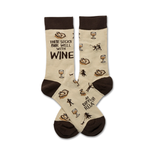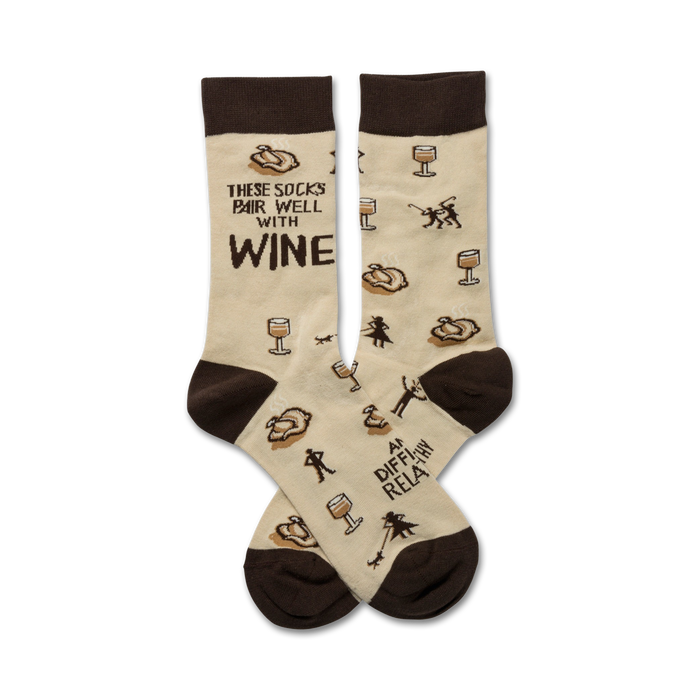 These "Socks Pair Well" socks are the perfect accessory for any wine lover! Featuring a playful pattern of wine glasses and the phrase "These Socks Pair Well With Wine...And Difficult Relatives," these socks add a touch of humor and personality to your sock game. Great for casual Fridays, a white elephant gift exchange, or your next wine night. Made for men, these crew length socks are sure to be a hit!