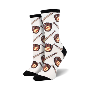 Looking for a fun way to show your love for the great American pastime? Look no further than Softball League crew socks! They are designed with a vibrant pattern of brown baseball gloves, bats, and yellow baseballs on a crisp white background. Whether you're a softball player, a fan, or just someone who loves fun socks, these are sure to fit the bill. Put on a pair and feel like you're stepping up to the plate every time you wear them. Who knows, they might even bring you good luck on game day!