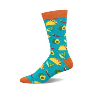 Some say tacos are the universe's way of giving us a hug in a shell. Now, imagine that warm and fuzzy feeling wrapped around your feet with these quirky taco socks. Crafted from an irresistibly soft bamboo blend, theyre the perfect fusion of comfort and fun. Rumor has it, once you experience bamboo, there's simply no turning back. Featuring a vibrant pattern of yellow tacos, green avocados, and red chili peppers against a cool blue backdrop with an orange cuff, these socks are here to spice up your wardrobe in the most delicious way possible.