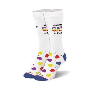 Embrace your fabulousness with these outrageously delightful 'Sounds Gay, I'm In!' socks! Sprinkle your feet with rainbow-colored hearts and a bold declaration of gay pride. These socks are the perfect accessory for any LGBTQIA+ fashionista looking to add a touch of humor and activism to their wardrobe. So, slip into a pair and let your feet do the talking!