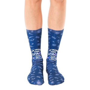 Say "Houston, I need some space!" in style with our Space From People Crew Socks. These comfy, sassy socks feature a vibrant, intergalactic pattern of planets, stars, and spaceships dancing across a celestial blue canvas. With the bold message "I'm Taking Space From People Today" playfully emblazoned on the soles, these socks are a fun and funky way to announce your need for personal space. Whether you're an introvert recharging, a space enthusiast lost in thought, or just someone who needs a break from the crowd, these socks let the universe know you're taking a pause.