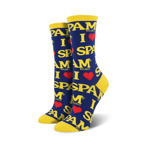 Calling all SPAM lovers! Show the world your quirky side with these fun blue crew socks designed for women. Featuring a vibrant pattern of red hearts and yellow letters spelling out "SPAM" and "I (heart) SPAM", these socks are the ultimate, tongue-in-cheek accessory for your feet. Say goodbye to boring hosiery and embrace the joy of SPAM with every step.