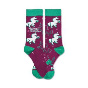 Unicorns are usually depicted as majestic creatures, far from everyday life. Our Special Unicorn socks bring that magic closer, with a vibrant pattern of prancing unicorns against a starry purple backdrop. On the green cuff, the question "Who's a special unicorn?" is posed, answered by the green toes and heels: "Me!" These women's crew socks will add a touch of whimsy to your day and a smile to your face.