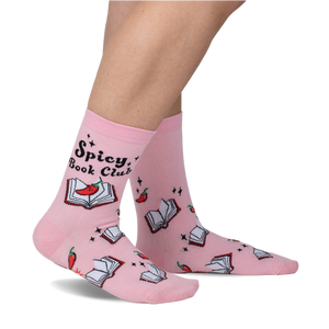 Light pink crew socks for anyone who likes their literature with a kick. They feature an all-over pattern of open books, each one showing a bright red chili pepper emerging from the pages. Little individual chili peppers are scattered across the fabric, along with small white sparkle shapes. On the visible side of one sock, the phrase "Spicy, Book Club" is written in a playful black font, surrounded by more of those tiny sparkles. These are a fun way to show off your love for reading, especially when the plot gets hot.