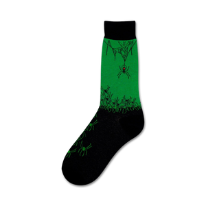 Black crew socks with green accents. But these are not just any green accents, they're spider webs and they're guarded by black spiders with bright red eyes. They are the perfect socks for arachnid enthusiasts or those who just love to make a statement with their feet. Fun fact: female spiders can lay hundreds of eggs at a time!