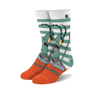 Dive into the vibrant world of Bikini Bottom with our Spongebob Squarepants Plankton socks! Join Plankton, the ambitious owner of the Chum Bucket, on his hilarious quest to steal the Krabby Patty secret formula. These crew-length socks, designed for both men and women, feature a white base with light green horizontal stripes and a mischievous Plankton graphic. They're perfect for fans of the iconic cartoon and anyone who appreciates a dash of humor in their sock drawer. Wear these socks and embrace Plankton's never-give-up attitude, reminding you that even the smallest creatures can achieve big things.