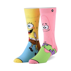 Put on your Spongebob and Patrick crew socks and dive into a world of undersea fun and adventure! These bright pink and yellow socks feature Spongebob on the left sock and his trusty sidekick Patrick on the right. Wear them for a day at the beach, a night on the town, or just to lounge around the house. Celebrate the friendship between these two iconic characters or gift these socks to any Spongebob fans in your life!