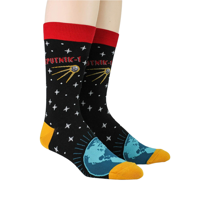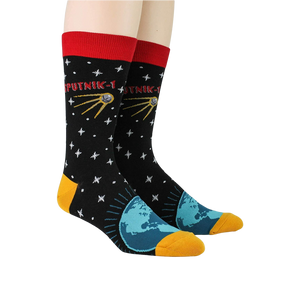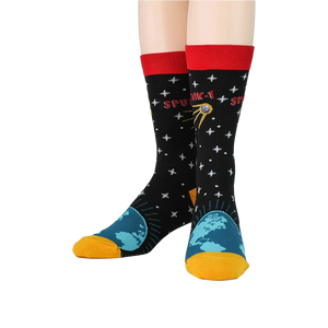 Blast off into the cosmos with our Sputnik Socks! They'll put the solar system right at your feet, featuring a star-spangled sky, Earth, and even a Sputnik with a bright, blazing trail. These rocket-powered crew socks will make every step intergalactic.