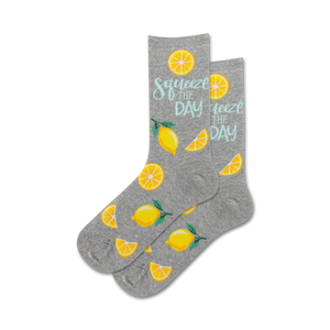 Brighten up your day with our Squeeze The Day lemon socks! These crew socks for women will add a touch of summer fun to any outfit. Featuring a pattern of juicy lemons and the encouraging phrase "Squeeze The Day," these socks are a reminder to make the most of every day. Whether you're running errands or just lounging at home, these cozy socks will keep you motivated and stylish.