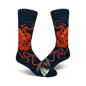 Dive into the deep sea with these "Squid & Whale" socks! Featuring an orange octopus attacking a sperm whale on a dark blue background, these crew-length socks for men are sure to make a splash. Show off your love for the ocean while keeping your feet cozy and stylish