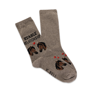The Stable Relationship socks are as solid as a horse's bond with their rider. The horses, nuzzling each other amidst red hearts, are a symbol of enduring strength. Wear these crew-length socks and feel the love. Perfect for any equine enthusiast or pun aficionado.