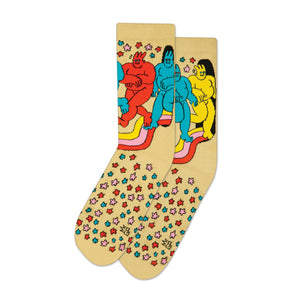 These 'Star Gazing' socks are a total vibe. They're a creamy, pale yellow-beige with a scattered pattern of tiny multicolored stars. The main design shows some seriously groovy figures- think bold, cartoonish shapes in red, blue, and yellow- all perched on a rainbow. It's whimsical and a little unexpected. The visible portions of the sock show the colorful characters are kinda dancing or hanging out. They're crew socks, and honestly? They're just plain fun.