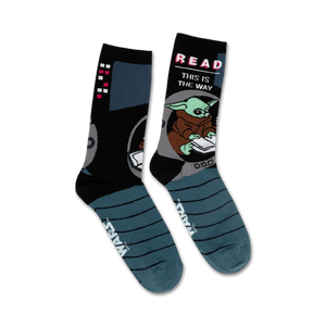 Grogu is a curious little dude, and he's always reading. These Star Wars socks feature a picture of Grogu sitting on a stack of books, so clever. The words "Read... This is the Way" are written above him, inspiring you to pick up a book and follow in his footsteps. These socks are sure to make you smile, and they're also a great conversation starter.