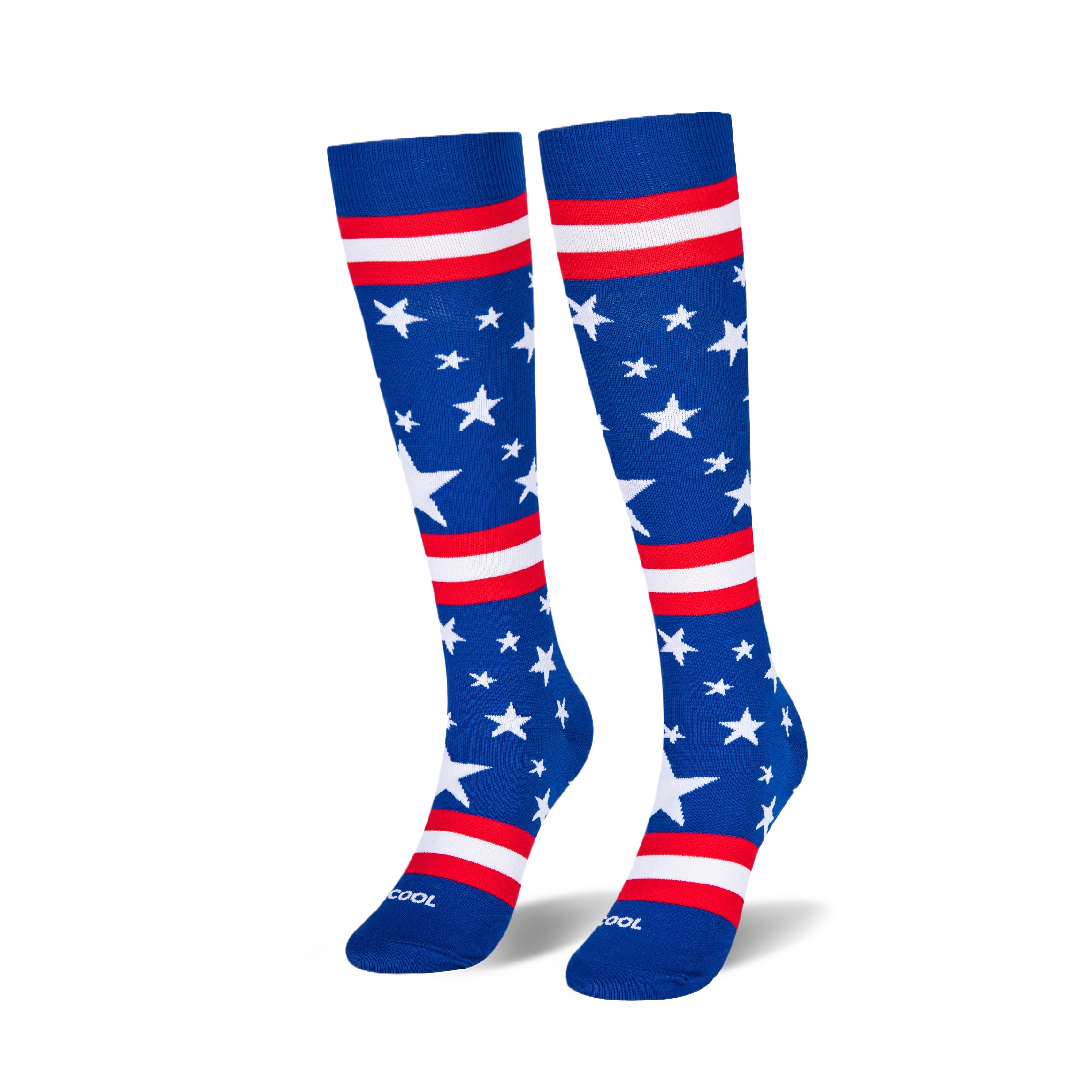 Show off some patriotic flair with this bold knee-high design. A vivid blue background is covered in scattered white stars of different sizes. Bright red and white horizontal stripes break up the pattern across the leg and foot. The tall cut works well for adding a pop of Americana to your sports gear or casual wear. They are vibrant, comfortable, and definitely make a bold visual statement.