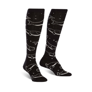 Stellar Whales Glow in the Dark! Dive into a sea of stars and frolic with these majestic creatures of the deep blue sea. These knee-high cosmic wonders boast a radiant, starry sky adorned with glowing whales. Embrace the enigma of the deep with every step you take in these luminous socks, glowing as brightly as the night sky! Slip into your own pair and let your feet be the ship that takes you into the depths of the cosmic ocean.
