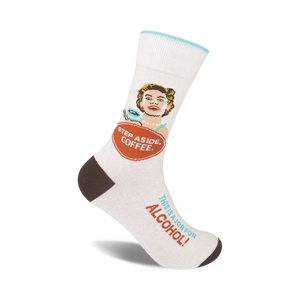 Need that extra boost of motivation to get the day started? Kick off your day with a cup of Joe in one hand and a pair of these 'Step Aside, Coffee" socks on your feet. Let the world know you mean business when you wear these comfy, white cotton socks with a brown heel and toe, a picture of a blonde bombshell with a coffee mug, and the words 'This is a job for alcohol' on the bottom. Whether you're sipping your morning coffee, downing a beer after work, or just lounging around, these women's crew socks will keep you cozy while making a bold statement about your love for the good life.