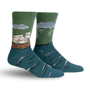 These 'Stormy Seas' socks are pretty neat. The main color is a teal-ish green, and they feature a sailing ship battling some pretty intense weather. One sock shows the ship sailing through choppy waves, while the other depicts a dramatic storm scene with lightning. The visible parts of the socks are a crew sock style. They're comfortable, fun, and a great conversation starter.