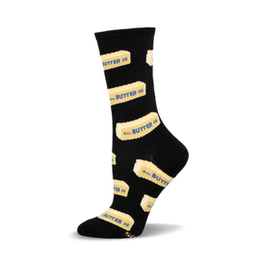 Golden, creamy, and irresistibly smooth, butter transcends its kitchen role to become a delightful fashion statement on these unique socks. With their playful pattern of yellow butter sticks stamped with "4 oz. BUTTER" in blue, these black socks are the perfect way to add a dash of culinary charm to your wardrobe. Whether you're a chef at heart or simply love a quirky twist, these butter socks ensure every step you take is full of flavor and fun.