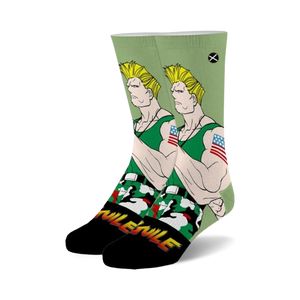 Sock it to 'em with Guile! Experience the power of the World Warrior with these Street Fighter 2 Guile socks. Step into a pair and let sonic booms explode from your feet. Get ready for a perfect match and feel the full force of Guile's flash kick. Even Bison can't handle your style when you're rocking these bad boys.