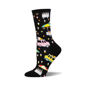 Step into the bustling streetscape of your dreams with our black crew socks, a tribute to the unsung heroes of quick bites and quick smiles. Patterned with an array of street vendors, from charming lunch carts to vibrant food trucks, these socks capture the essence of urban munching. Scattered about are playful dollops of ice cream, twists of pretzels, and splashes of ketchup and mustard—turning your toes into a delicious display of street fare flair. Perfect for the urban explorer with a taste for adventure and a penchant for style.