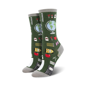 Meet the Study Buddies crew socks! These dark green socks are covered in a pattern of classic school supplies like pencils, globes, apples, rulers, notebooks, scissors, and glue sticks. Whether you're a student, teacher, or just love school supplies, these socks will add a fun pop of personality to your outfit. Plus, they're made with a soft and comfortable blend of fibers, so you can wear them all day long.