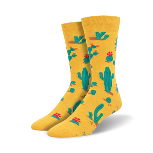 Prick up your feet with these Succ It Up Cactus socks that'll make your soles the center of attention. Don't be a prick and miss out on these unique, eye-catching socks featuring a pattern of green cacti and vibrant red flowers against a cheerful yellow background. Whether you're hitting the town or just lounging at home, these crew-length socks will add a touch of fun to your look. Plus, with their reinforced toe and heel, these socks are as durable as a cactus in the desert! Show off your love for nature and stand tall with these blooming beauties on your feet.